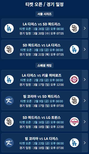 - [3월 20일] LA 다저스 vs SD 파드리스 - 예매 시작: 1월 26일 (금) 20:00